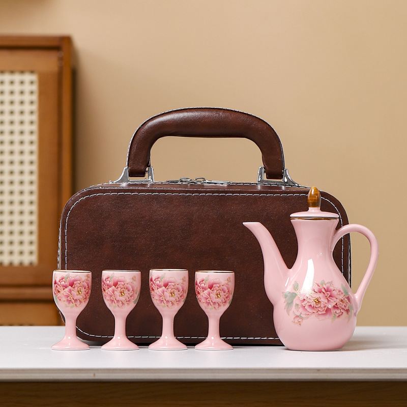 5 ピンク Ruyao ワインセットレザーボックスセラミック白ワインカップ家庭用ワインディスペンサーホット温度青磁ワインボトルギフトボックスセット