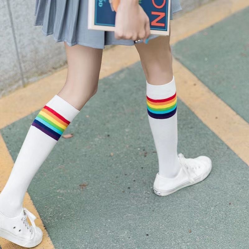 ふくらはぎの靴下の女性の春夏の薄いタイプの虹のストライプのストッキングの韓国版の運動の半筒の靴下のネットの赤いinsの潮流の学院の風