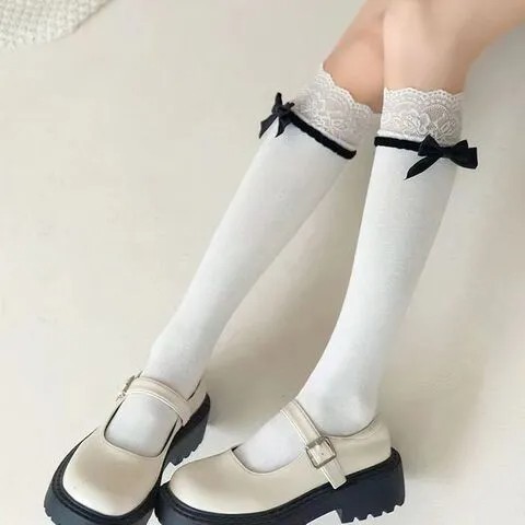 ホワイトレース新ロリータカーフソックス甘いミッドカーフソックス日本製リボン2024春夏滑り止めレース