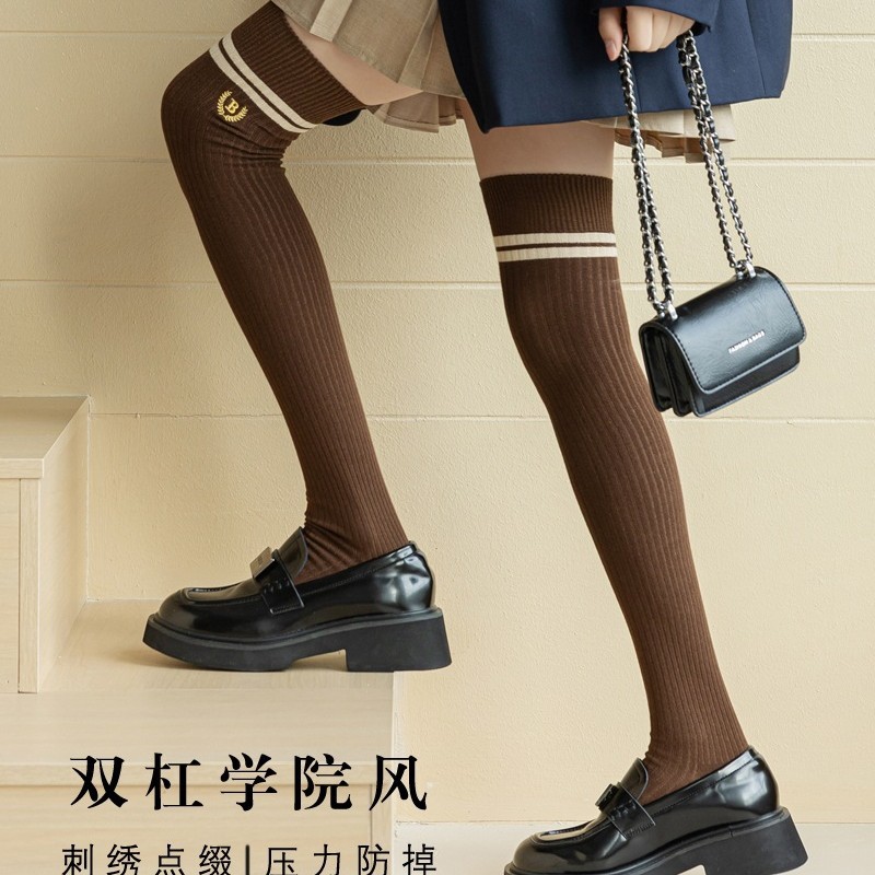 JK縦条抜条圧力やせ脚純綿双針棒刺繍学院風二棒膝長筒太もも女子靴下