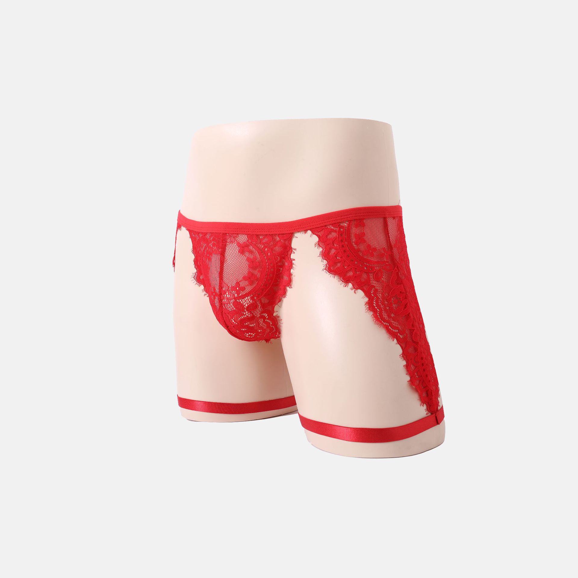 メンズセクシーパンツ、四隅ストラップ付きレギンス、セクシーレースシースルー誘惑下着、ローウエスト浮気ブリーフ
