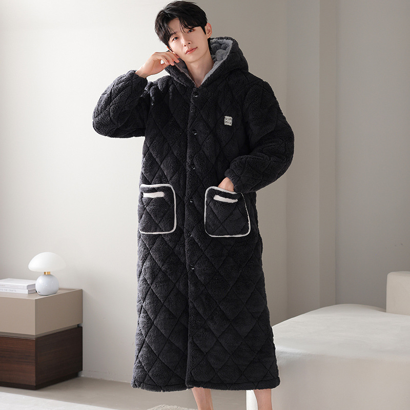 三層綿を挟んだ男性用の寝衣冬の純色の帽子とサンゴの綿毛の保温青年家庭服の長いタイプの綿入りの寝衣