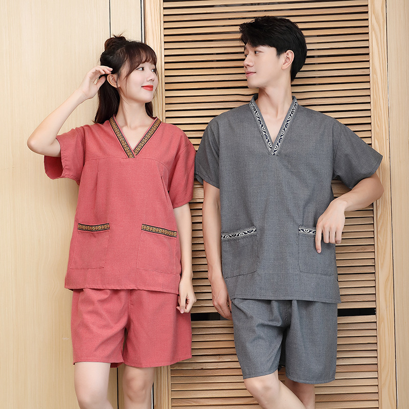 メーカーの綿貢麻艾灸服カップルの男女の前と後ろのボタンの汗蒸服の理学療法マッサージの入浴服の背中の卸売り
