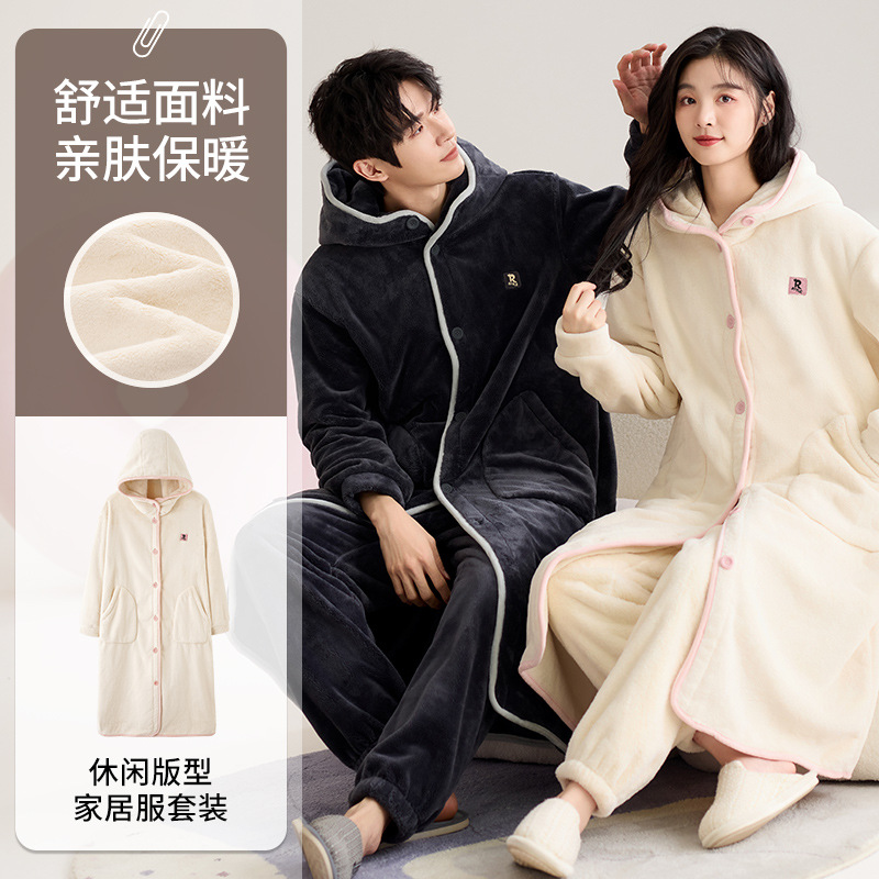 フランネル秋冬カップルパジャマ女性フード付きホームウェアベルベット厚手保温ウール男性用パジャマセット