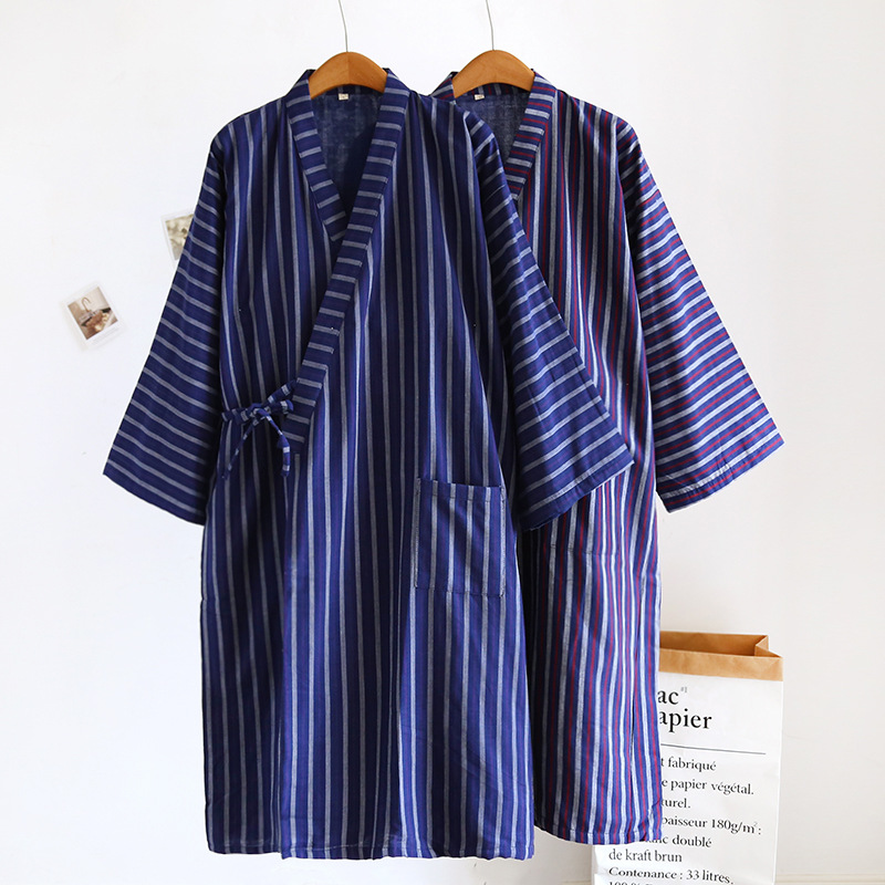 日本式の二重綿ガーゼの男性の着物はパジャマの春と秋の薄いストライプのバスローブの部屋のパジャマを持っています。
