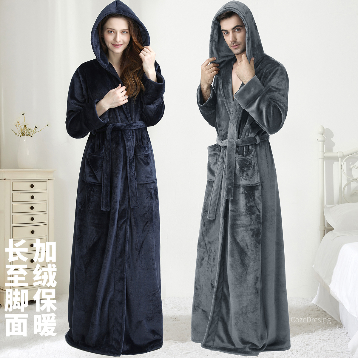 カップル向け秋冬厚手保温ロング丈フランネルナイトガウン男女兼用大きいサイズコーラルベルベットバスローブフード付きパジャマ