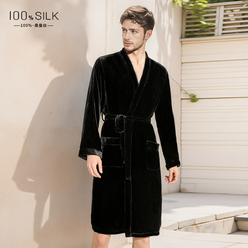 シルクベルベットの男性用ナイトガウン、春秋用、厚手で暖かい、外でも着用可能、ミドル丈のバスローブ、桑蚕糸のホームウェア、モーニングローブ