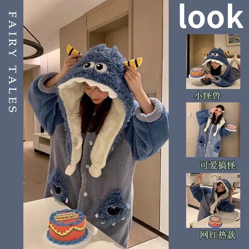 小怪獣のサンゴの毛を厚くして、男性の寝衣の女性の冬のかわいいアニメの長いフランネルのバスローブのパジャマを着ます。