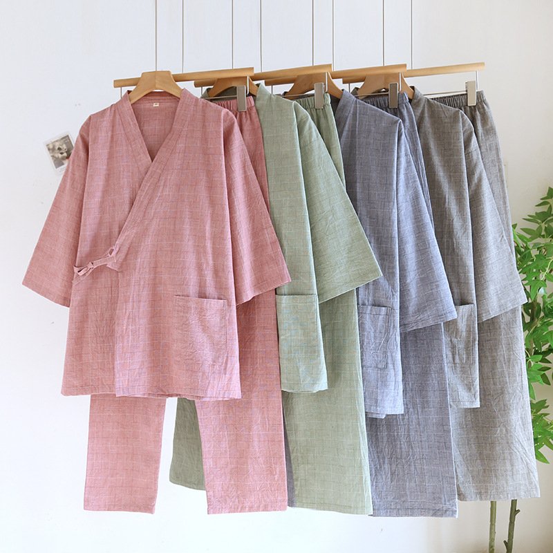 無印水洗い綿質和装二重ガーゼカップルパジャマ春夏薄手男レディース汗蒸しホームウェア