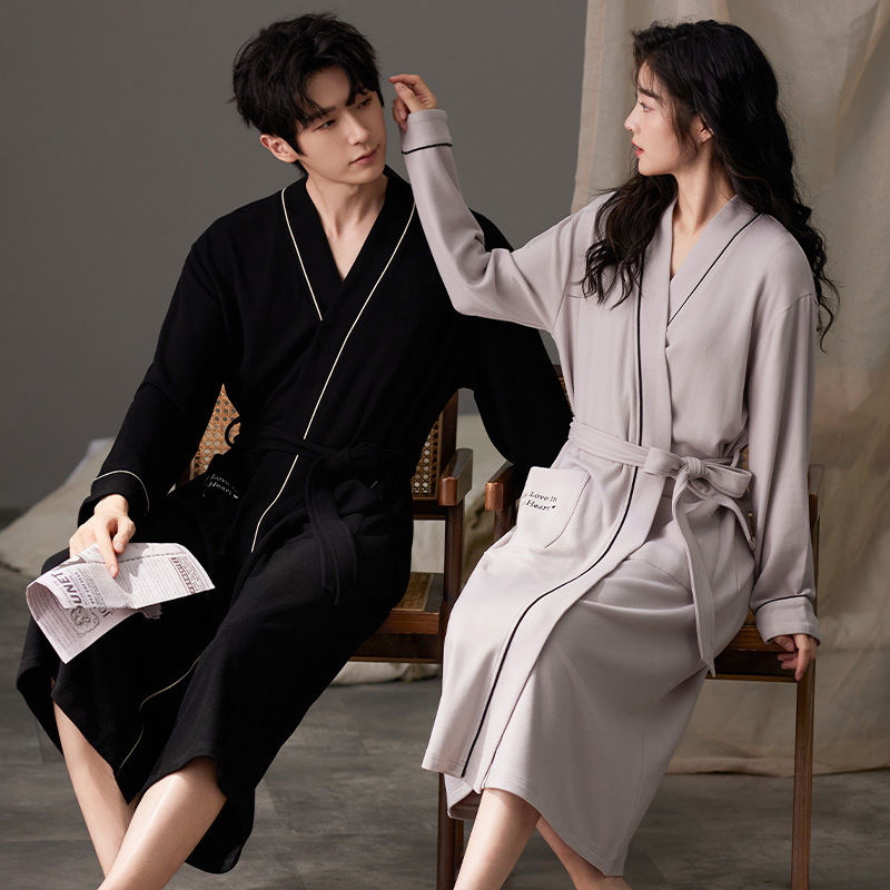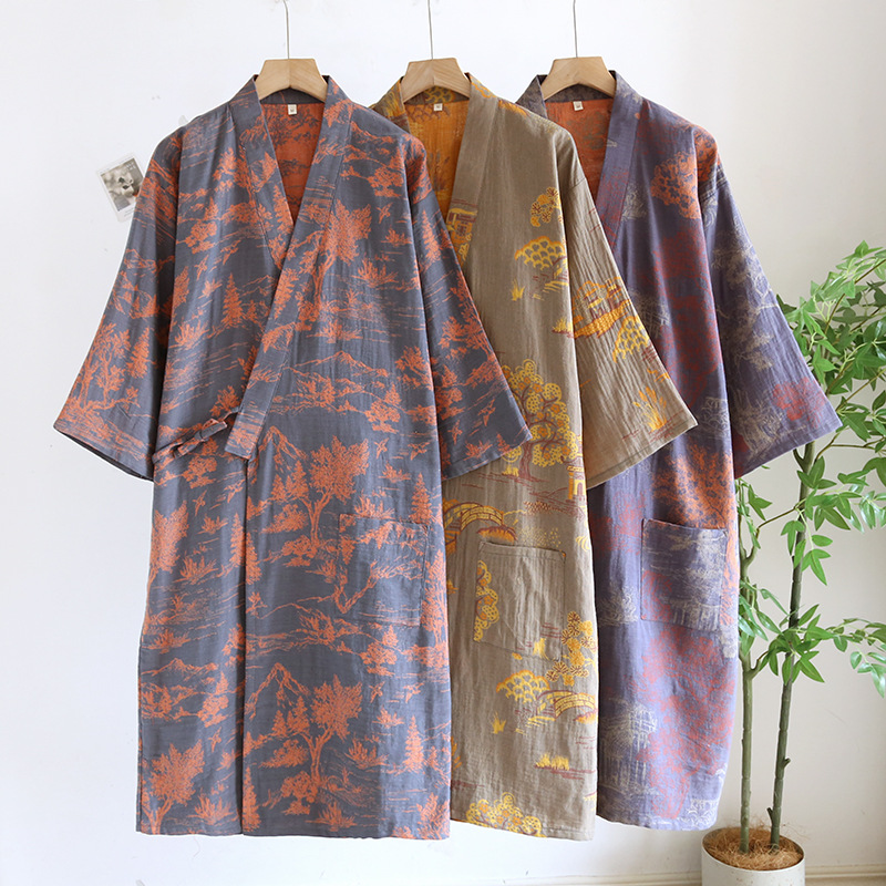春秋カップル高級色織純綿二重ガーゼ寝衣男中長タイプ国風カーディガン和風浴衣バスローブ