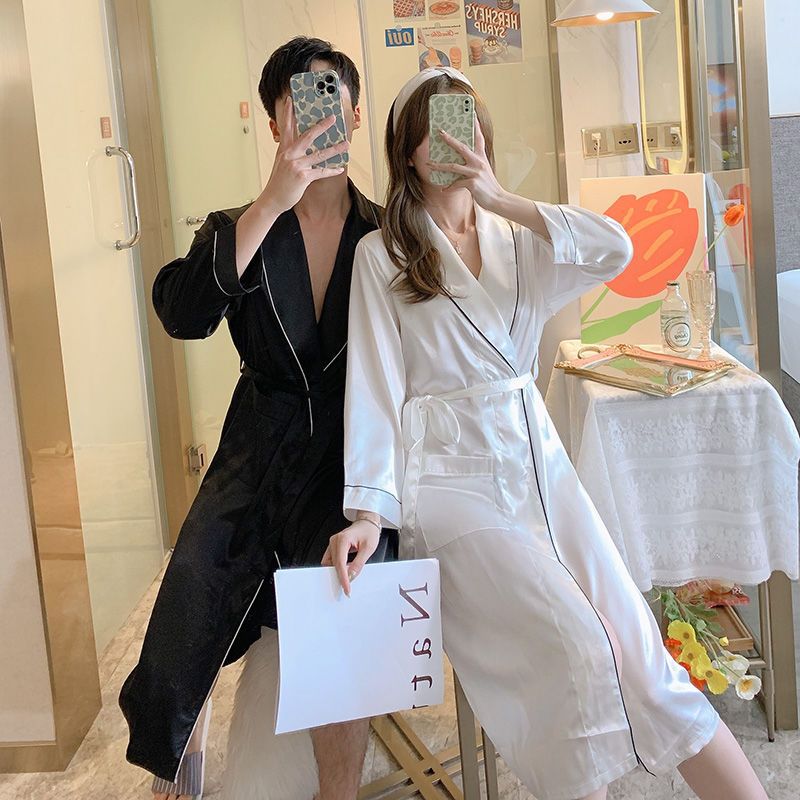 春と秋の男性と女性の模造シルクバスローブ、ナイトガウン、ホームウェア、軽い高級感、通気性、柔らかさ、シルクの感触
