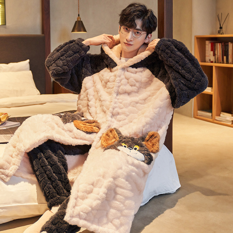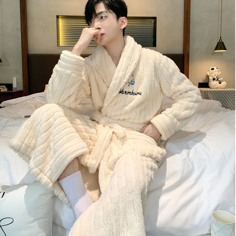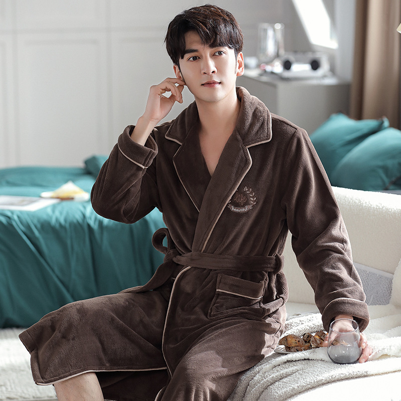 男性用秋と冬のロングナイトガウン、コーラルベルベットバスローブ、若いパジャマ、冬の厚いフランネルバスローブ、ホーム服