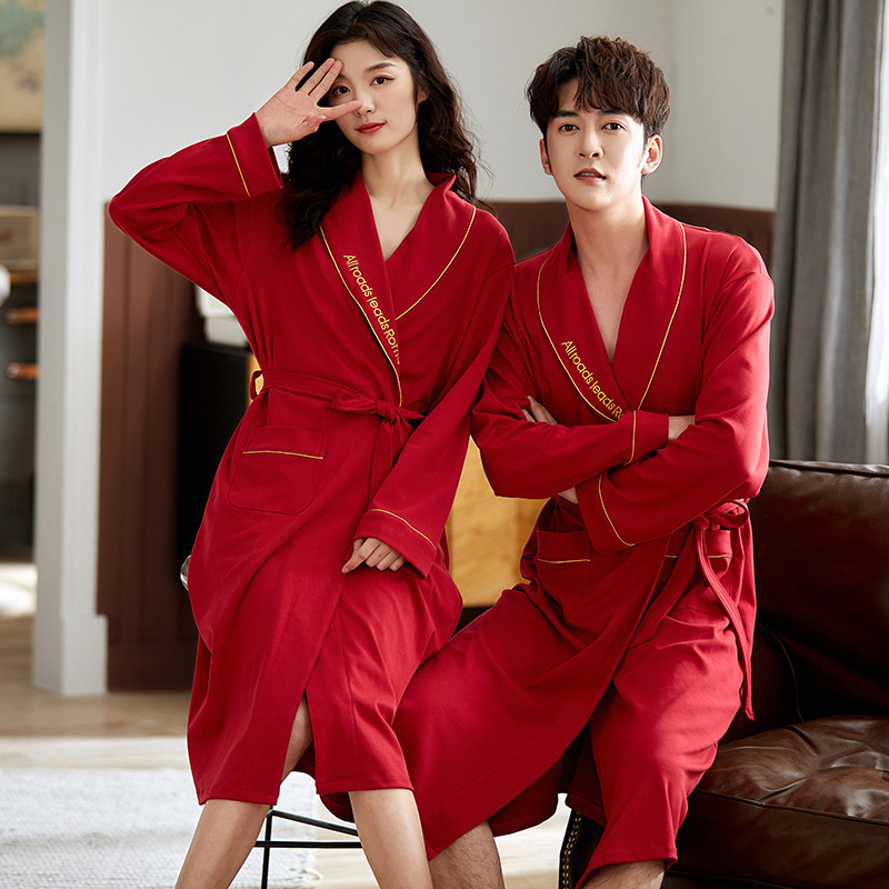 カップルパジャマ女性秋冬長袖綿質プラスサイズバスローブ男性本命年ミディアムロング赤いホームウェア