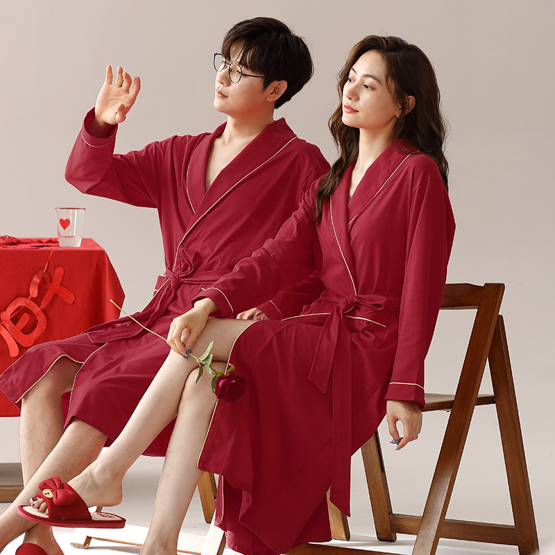 カップルパジャマ女性秋冬長袖綿質プラスサイズのバスローブ男性本命年お祝い大赤色ホームウェア