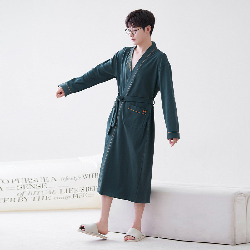 男性の長袖の寝衣の春と秋の純綿の浴衣の中の長いタイプのバスローブの純色はゆったりしています。