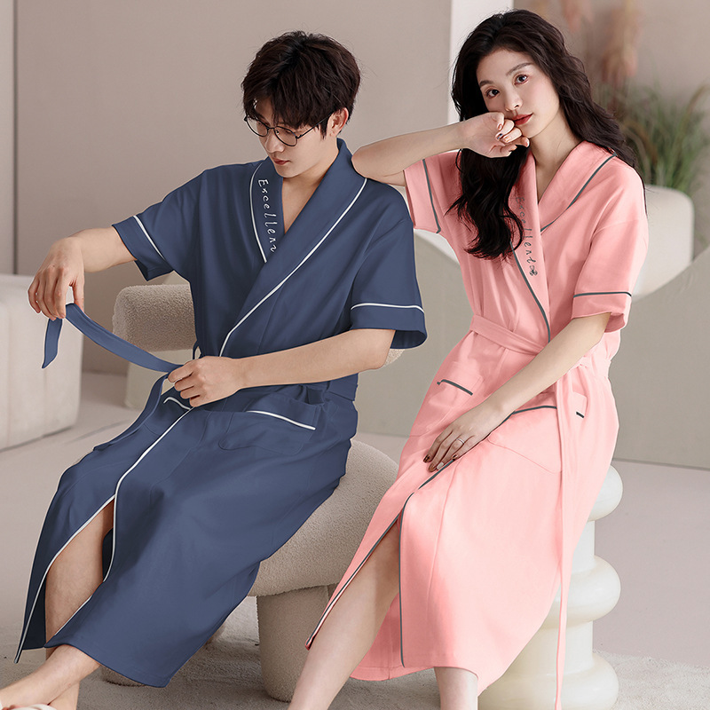 2025 新しい甘いスタイルのカップルのナイトガウンとバスローブ夏半袖純綿ペア中長スタイルの男性と女性は屋外で着用できます