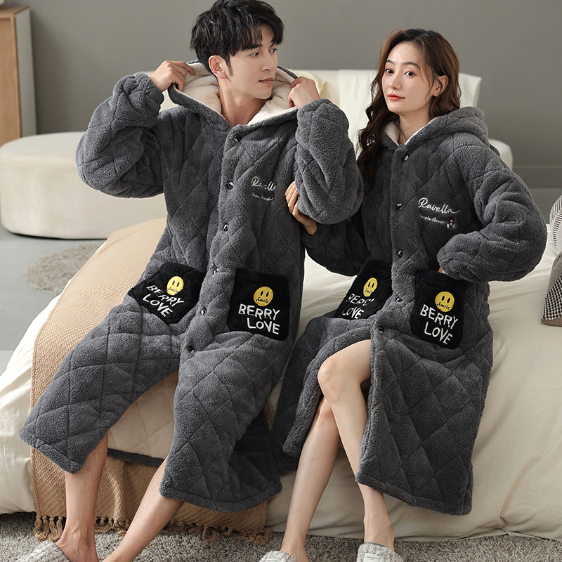 綿を挟んだカップルのカーディガンの寝衣は帽子とベルベットの厚い保温男性女性のバスローブの綿入れの上着の家の服の冬2025