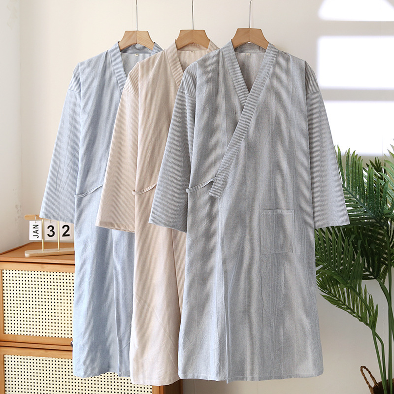 和風帯着物パジャマ男性春夏薄手綿ガーゼ縞薄手ゆったりバスローブ汗蒸しホームウェア