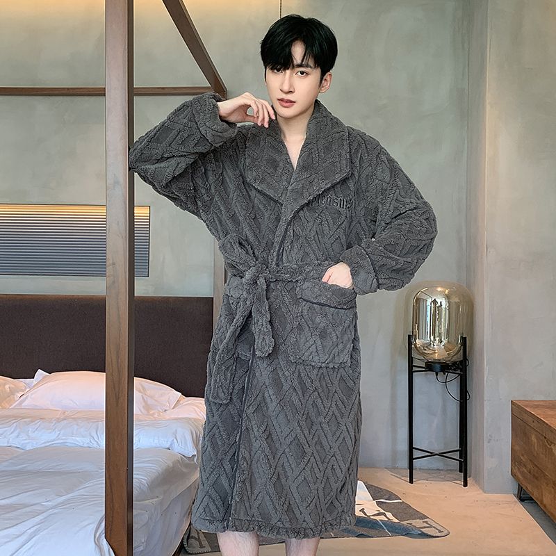 パジャマ男性コーラルベルベット秋冬厚いベルベット暖かいパジャマ冬ミディアムロング男性バスローブホームウェア