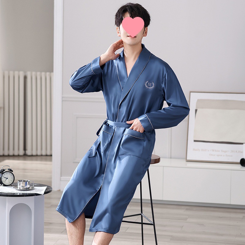 高級感のある豪華な男性の寝衣春の薄いバスローブの浴衣の夏の氷のシルクの長袖の長い部屋の服の男性