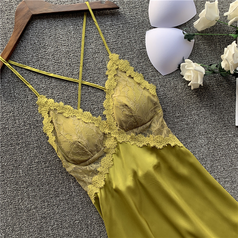 セクシーなパジャマの女性の夏の氷の薄い金は胸のパッドのレースのガーターの睡眠のスカートのスーツの情緒の誘惑の震えの音の金を持ちます。