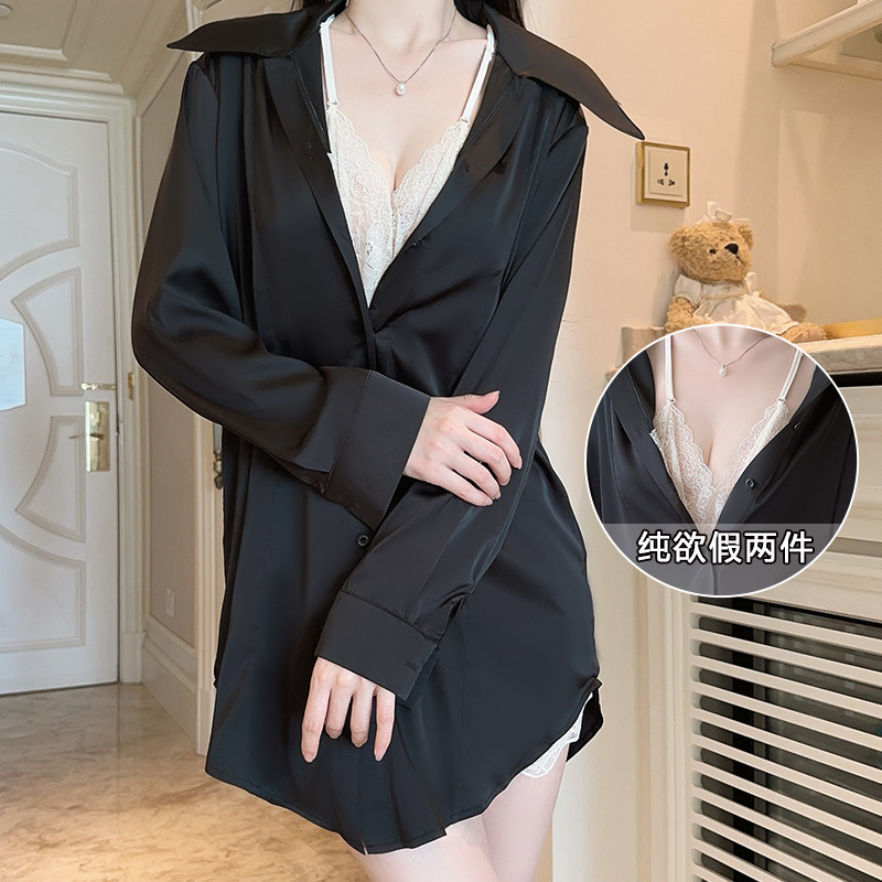 セクシーな彼氏風シャツの大きいサイズのパジャマは純粋で薄いレースのゆったりした家庭服のパジャマセット1141です。