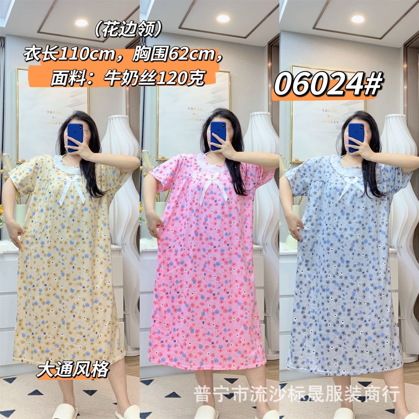 大通スタイルクロスボーダー外国貿易 2025 夏の新ミルクシルク小花柄パジャマドレスレース半袖ファットナイトガウン