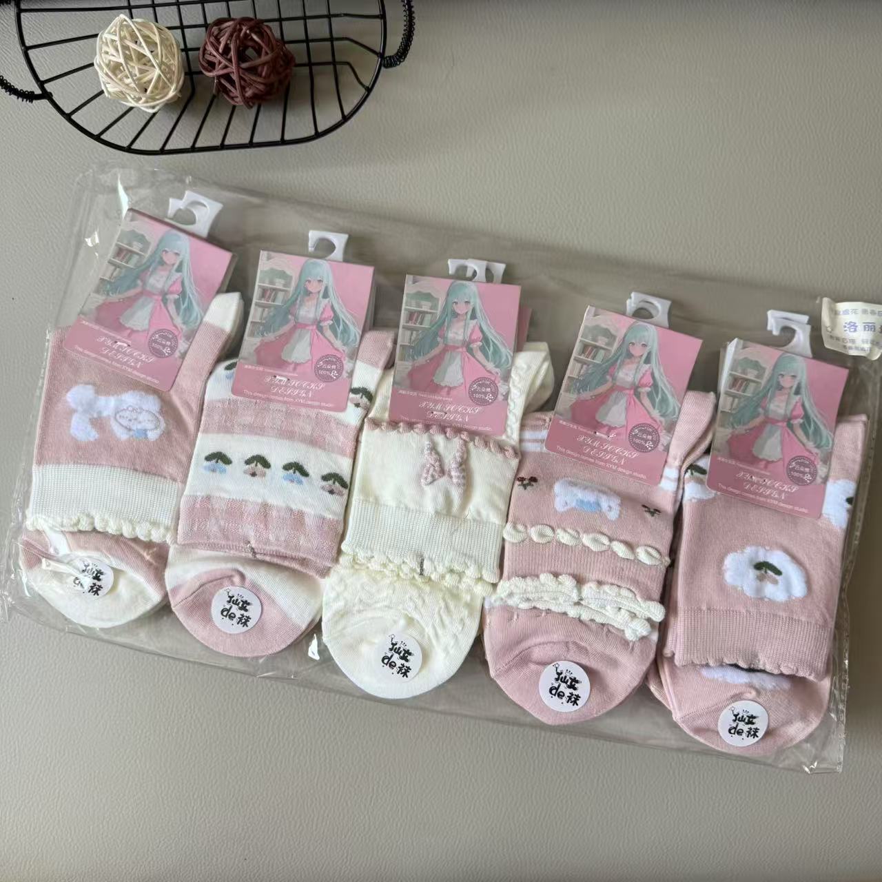 秋冬新作レディースミッドカーフソックス、通気性があり多用途な学生ソックス、かわいい漫画レースの日本と韓国のカレッジスタイルコットンソックス