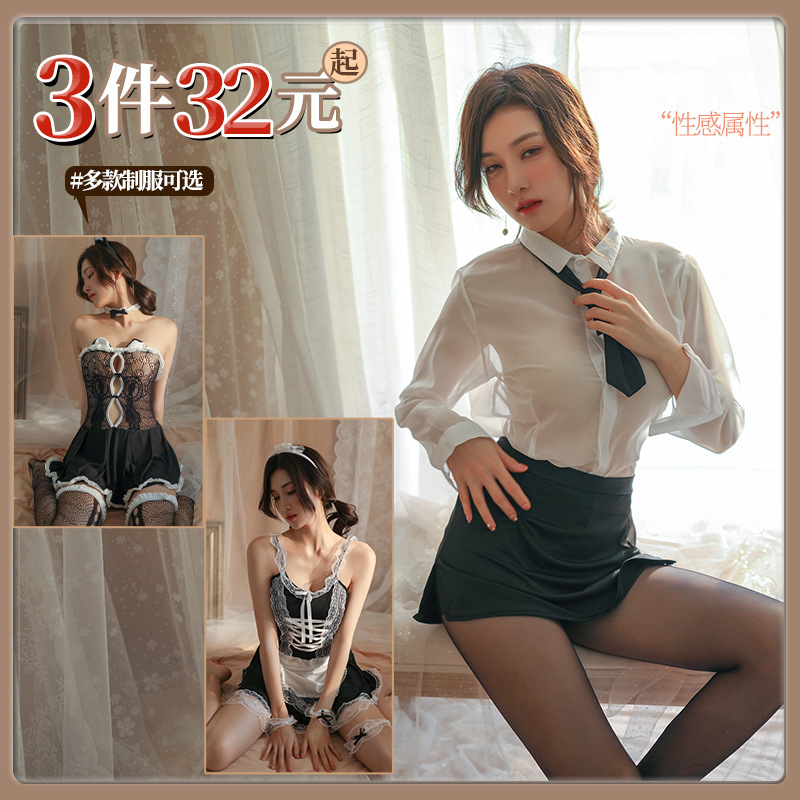 セクシーな下着のメイド服の黒い糸のベッドの上で熱いセクシーなパジャマを誘惑します。