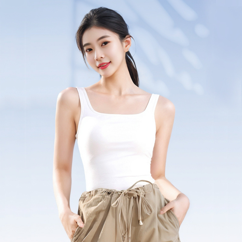レディース綿100% ノースリーブタンクトップ 春新作 工場卸売 カジュアル スクエアネック 胸パッド入り 女性用タンクトップ