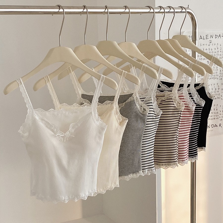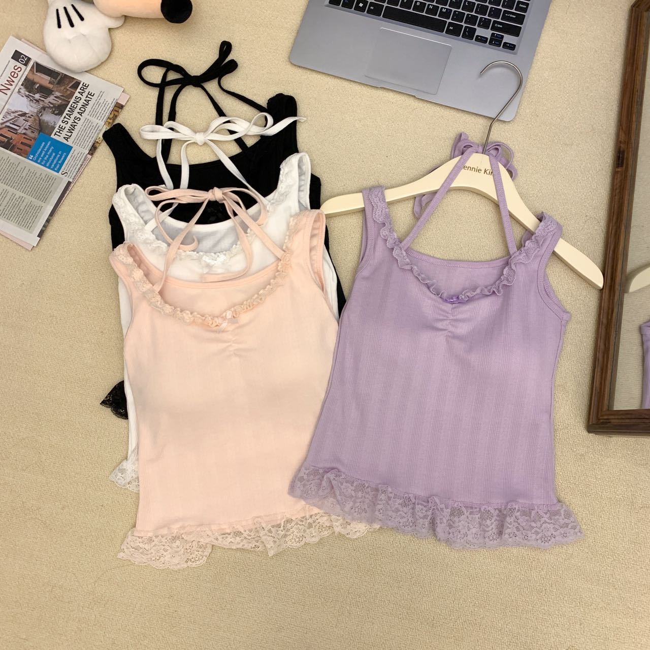 春夏デザインの女性用リボンキャミソール、レース、スリムフィット、インナーレイヤードトップ