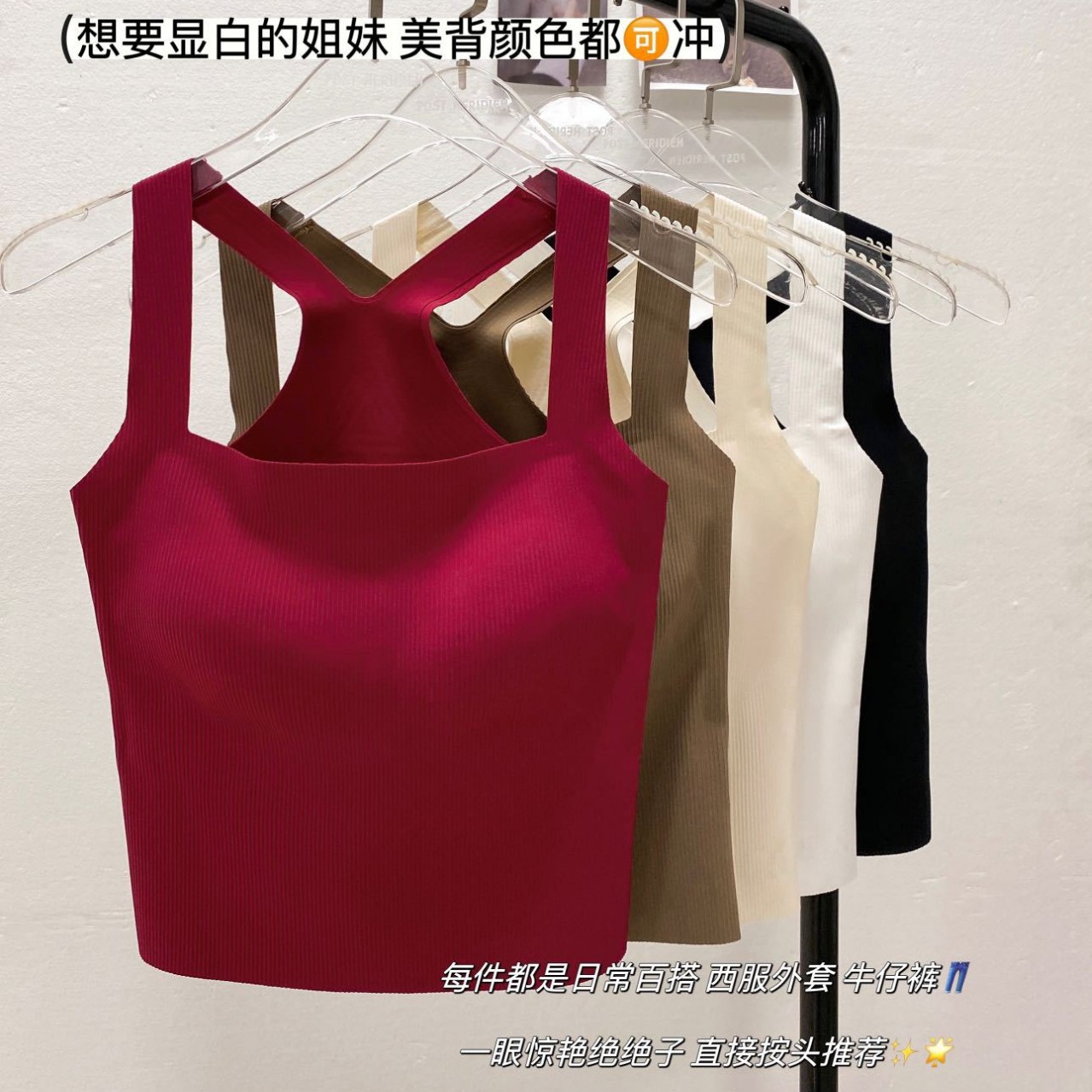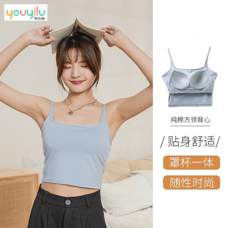 オールマッチのスクエアネックストラップ、固定胸パッド、ワイドショルダーベスト、シングルウェア、大きなU字型の美しいバックインナー、高品質バージョンコットンボトムトップ