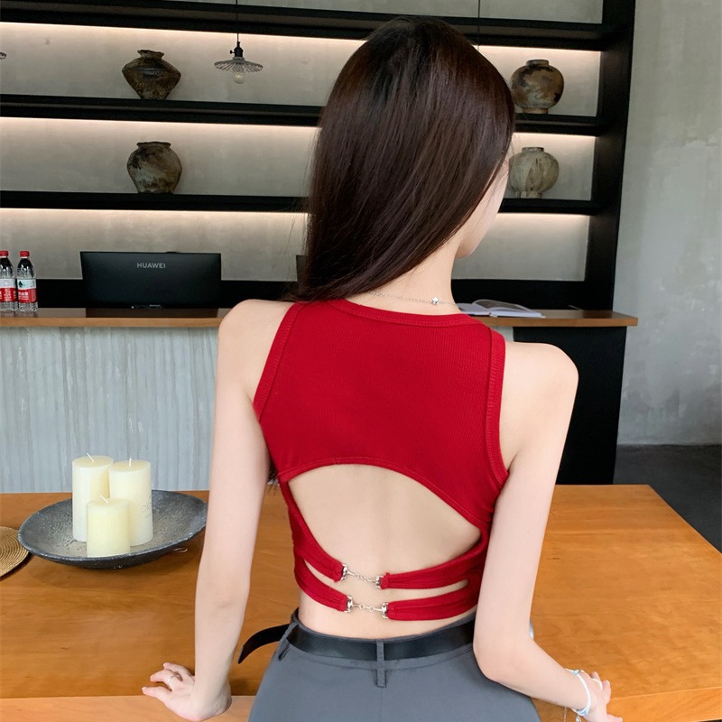 夏の新しいアメリカンホットガールI字型ベスト、胸パッド付き、セクシーな小さなスクエアネックバックレスクロスサスペンダートップ