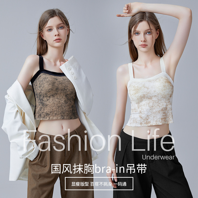 秋冬プリント水墨画風ベルベット美背インナー兼アウター、カップ付きプッシュアップブラ、レディースベスト、キャミソール、万能、新国民風