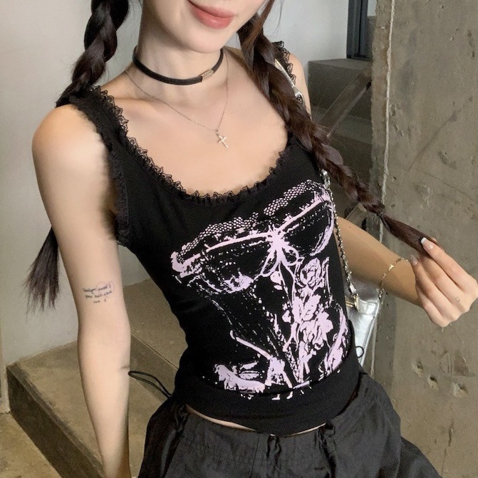 アメリカの甘いギャルのキャミソールのレースの個性的なプリントは胸のパッドの中でガードルを掛けて袖なしの上着を着ます。