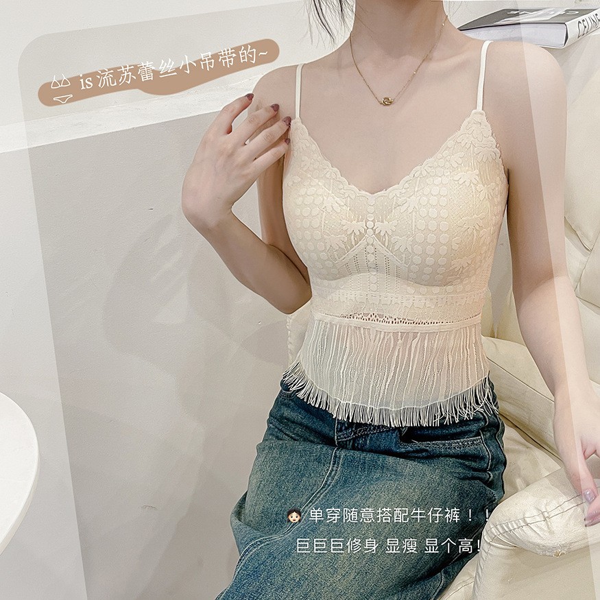 フリンジレース美背サスペンダー女性早秋新作vネック固定カップ下着ファッションミディアムロング底ベスト潮