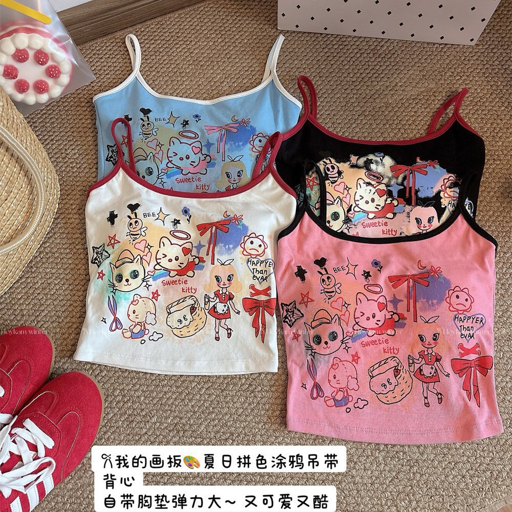 6989 # ドーパミンかわいい漫画落書きキャミソール夏のホットガール胸パッド付きスリムショート年齢軽減トップ