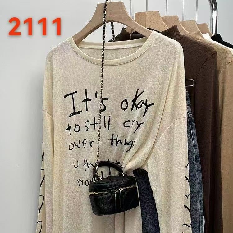 2111 # 新しいアメリカのレトロなアルファベットのプリント長袖tシャツの女性の怠惰でゆるい薄いタイプの日焼け止めブラウスの上着