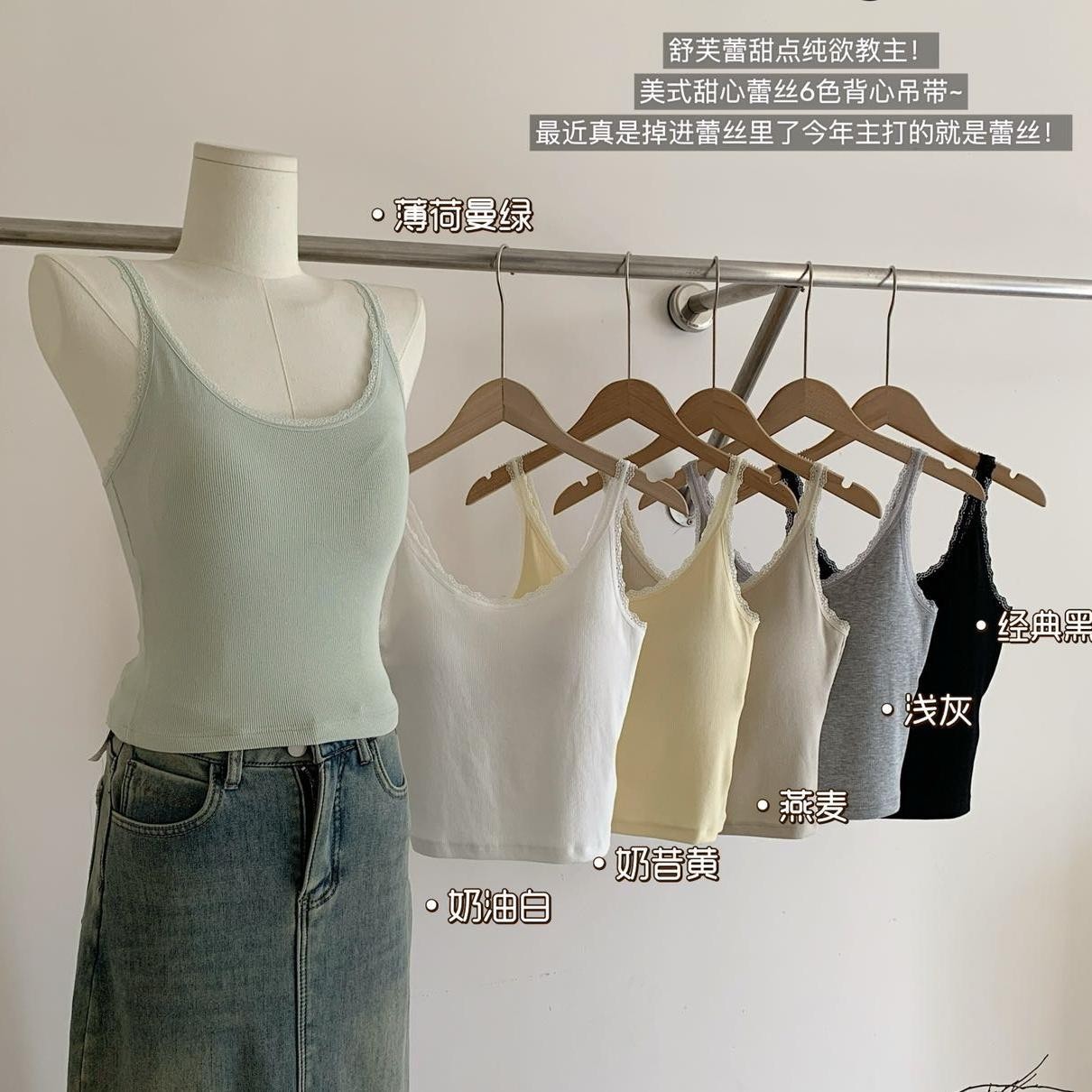 女性用のハイエンドレースバックキャミソール、女性用のシームレスで通気性があり多用途の胸パッド付きレースキャミソール