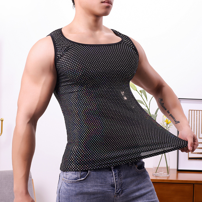 男性ベスト夏2025新型フィットネス工字カン肩潮流痞帅クラブ歌手キラキラ袖なしtシャツ
