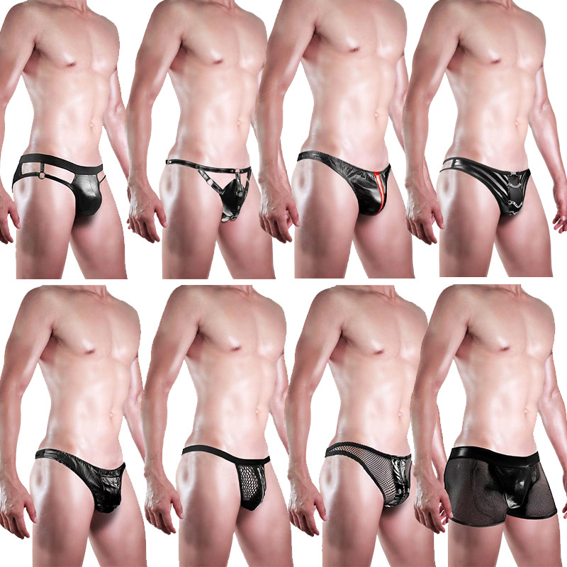 男性の趣味下着セクシーなエナメルtパンツ透明なネット生地が浮気をしている