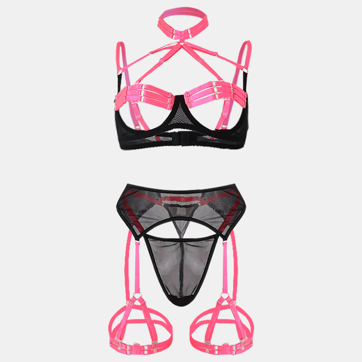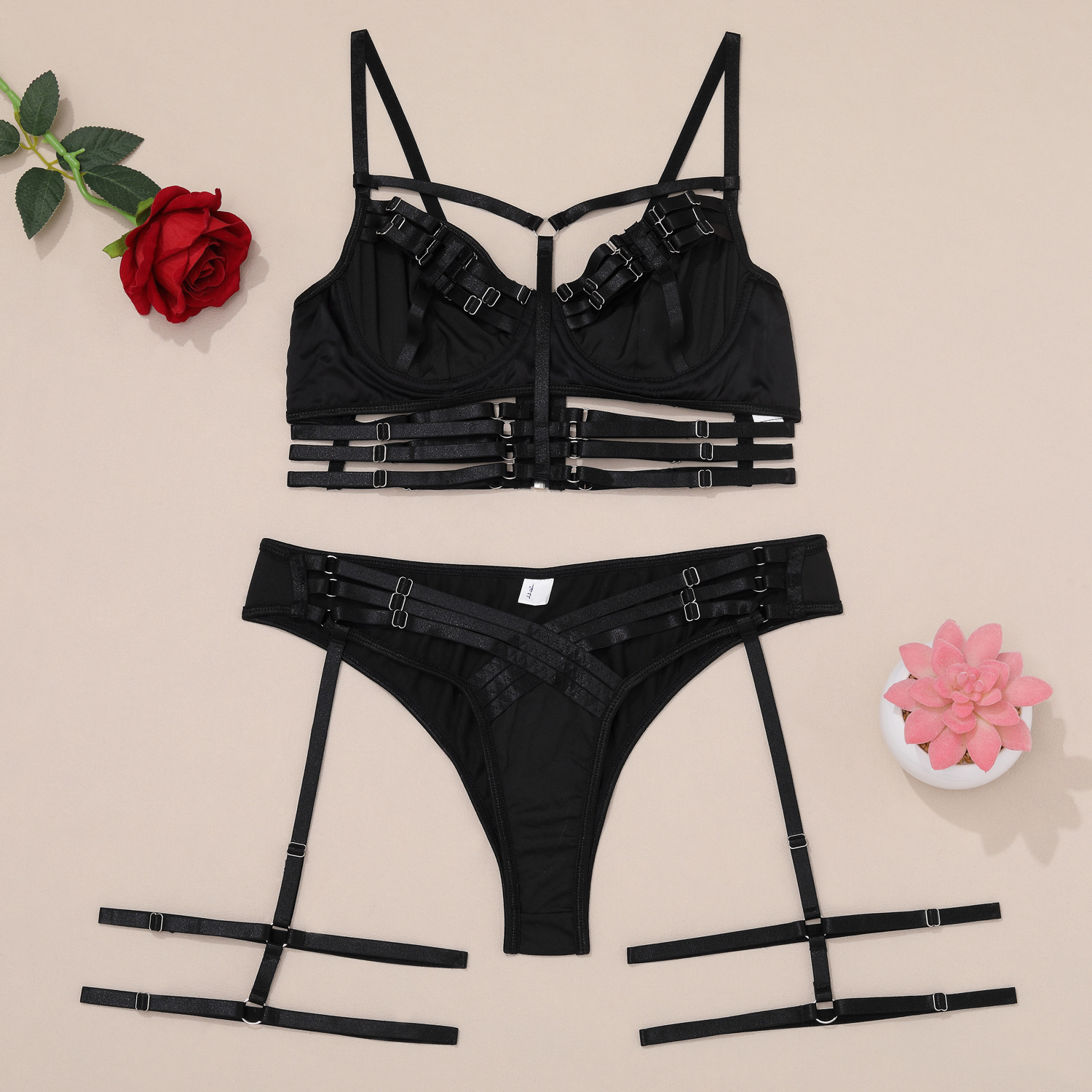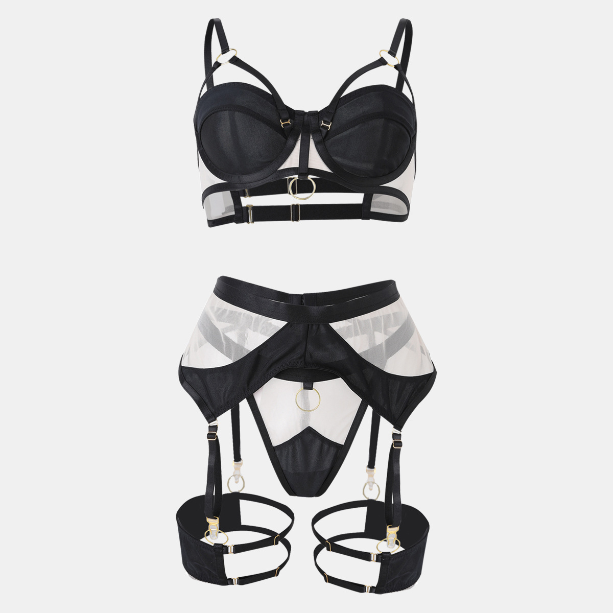 欧米の新型のストラップの金属の愛のチェーンの趣味のスーツの透視レースの誘惑の女性の下着のガーターのスーツ