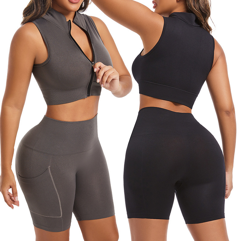 クロスボーダーシームレスライディングランニングベスト文ブラジャー前ファスナーフィットネス運動無痕提尻ヨガ服セット