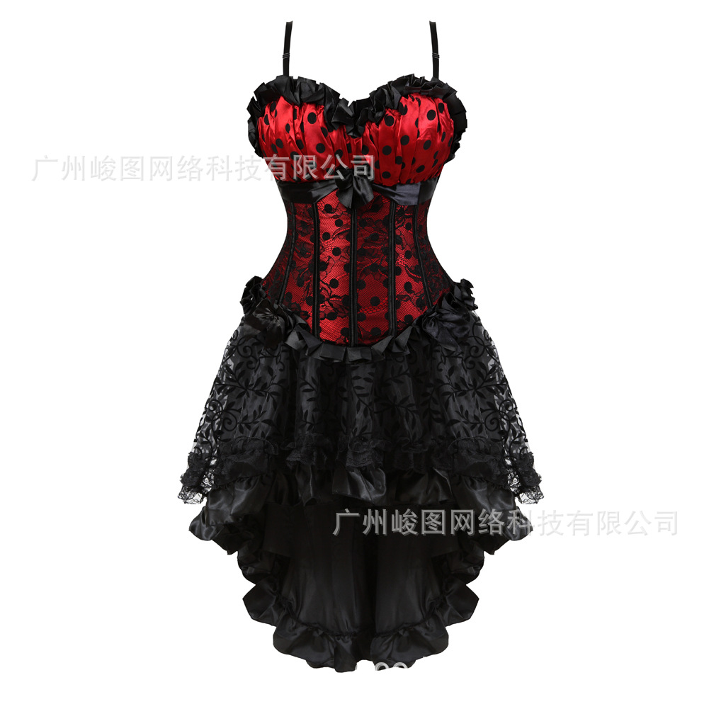 丸いボディスーツの細い肩ベルトのコルセットの中世の半身のスカートの植毛の黒いスカート
