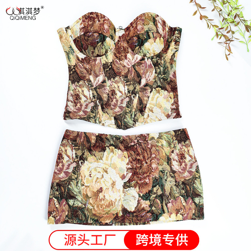 クロスボーダー油絵レトロジャカードコルセット超短バッグヒップスカートセットコルセット分体式2点セット