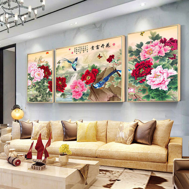 牡丹三連装飾画客間ソファー背景壁画花開富貴結晶磁器画孔雀壁画ヨーロッパ風威東