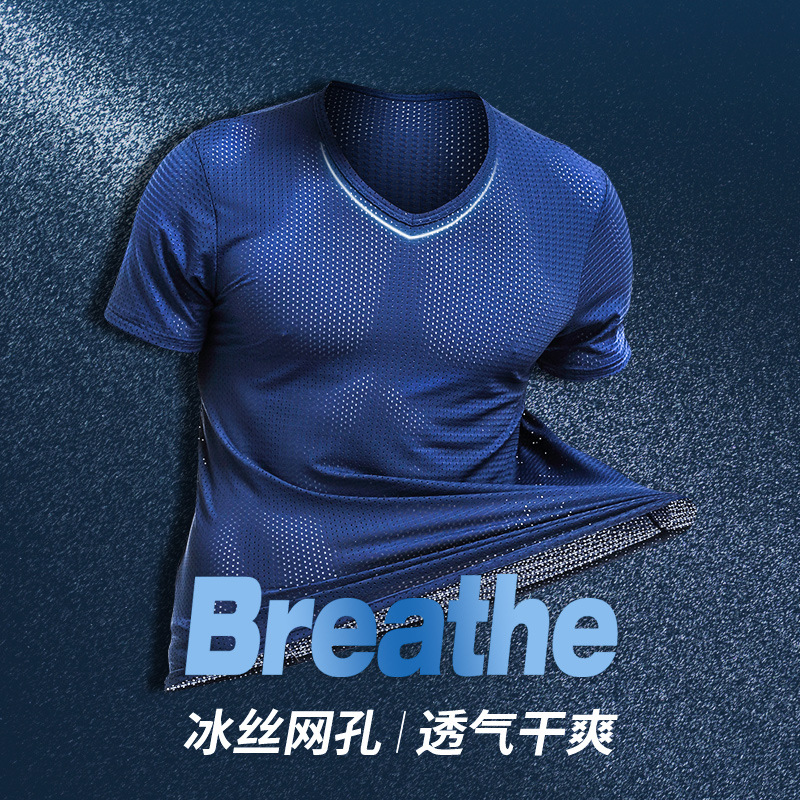 Tシャツメンズファッション夏2022新作ライトボードアイスシルク速乾衣半袖弾力メッシュ丸襟薄い金