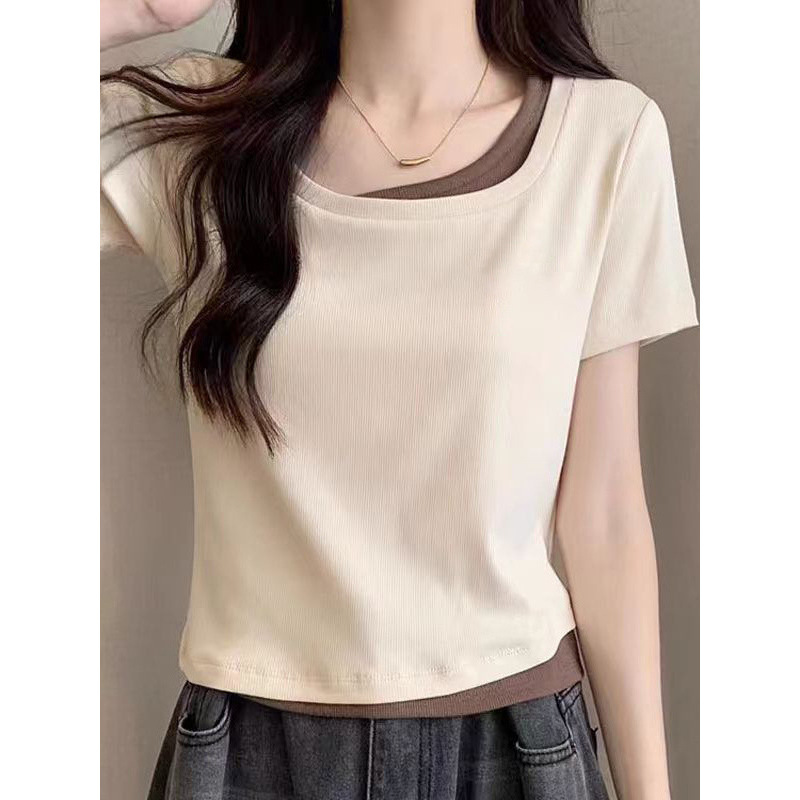綿100% パッチワーク フェイクツーピース 右肩半袖Tシャツ レディース 2024年夏新作 ゆったり着痩せお腹カバートップ
