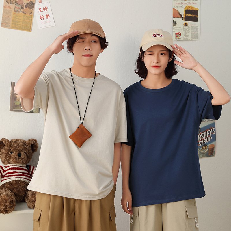200g半袖落肩重ポンドtシャツ底新疆綿純色日系復古丸襟ゆるい男女文化シャツ