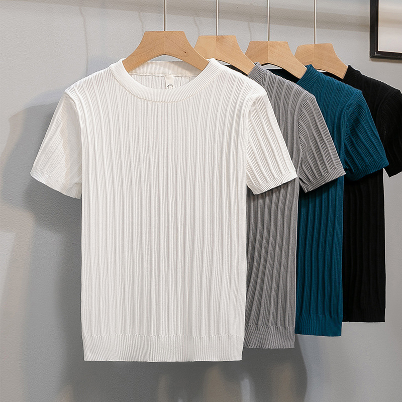 メンズニット半袖Tシャツ、高級純白ボトムシャツ、メンズカジュアルスリムインナー半袖トップス